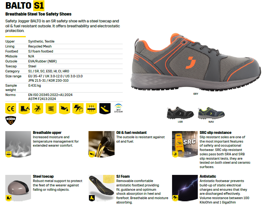 Low-cut safety shoe designed to cater to your every need. The BALTO safety shoe offers superior slip resistance, ensuring a tight grip on various surfaces. It features a robust steel toe cap to shield your feet from falling objects, making it ideal for automotive, logistics, and industrial environments. The BALTO boasts an oil and fuel-resistant outsole, and a breathable upper for optimal comfort, keeping your feet cool and fresh all day. It also aids in relieving body posture pain, and its electrostatic build-up protection keeps you safe from static sparks or charges. Practical, versatile, and affordable, the BALTO is your go-to safety shoe for multiple uses in dry environments.